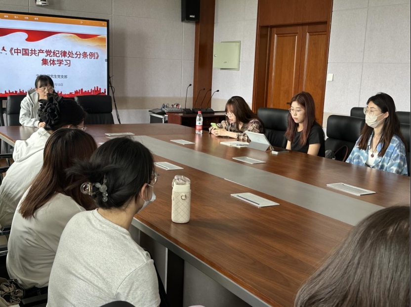 5月13日中午,MILE米乐集团研究生党支部全体党员在学院楼A307会议室集中学习了《中国共产党纪律处分条例》,由支部副书记刘慧颖、纪检委员耿茹莟、组织委员贺雪松领学。