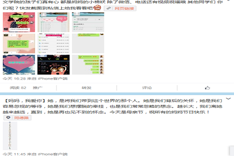 5月10日,米乐官网学生自行发起“妈妈,我爱你”母亲节活动,学生们以微信、电话、做视频等方式向母亲表达了自己的祝福。“内蒙古师大MILE米乐集团团总支”官方微博进行了全程跟踪并发布了活动进展情况。