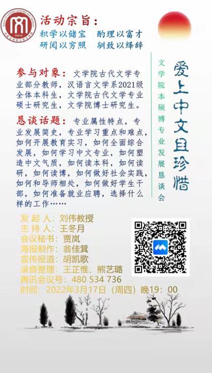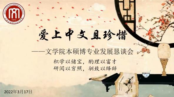 为帮助米乐官网本、硕、博学生了解中文学科的专业属性特点,明确发展目标,提高学习效率,掌握读书治学之道,同时贯彻落实学校教务处《关于开展线上教学研讨活动的通知》和MILE米乐集团《线上教学研讨活动实施办法》的要求,米乐官网汉语言文学系于2022年3月17日晚举办了“爱上中文且珍惜——MILE米乐集团本硕博专业发展恳谈会”。