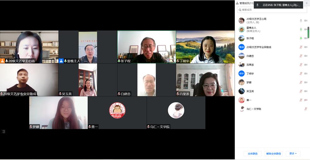 2022年4月24日上午,米乐官网文艺学专业硕士研究生课题论证会在腾讯会议举行。文艺学专业研究生导师万奇教授,白建忠教授,张树天教授,郭培筠教授,张子程教授,吴玉英副教授,以及本专业20级、21级研究生参加了论证会。会议由学位点主任万奇教授主持。2020级文艺学王心雨、梦娜、丁明宇、吴敬成4位同学依次做了开题报告,分别介绍了选题背景,选题研究价值,研究现状,研究思路方法和研究的具体内容、创新点等。各位导师针对每位研究生的开题报告做了全方位的细致点评。本次论证会是对2020级学生学习成果的检验,也是文艺学专业良好学风的体现。