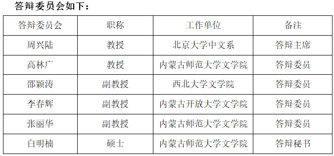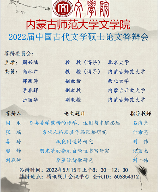 中国古代文学专业定于2022年5月15日上午(8:30-12:30)召开2022届硕士学位论文答辩会。根据学校《关于做好2022年上半年博士、硕士研究生学位授予工作的通知》《关于做好疫情防控期间2022届研究生毕业答辩工作的通知》的要求,本次答辩采用的方式为网络视频答辩,使用的远程会议软件为腾讯会议,会议号为(会议号为:605-854-312)。本次答辩会特别邀请了北京大学中文系教授、博士生导师周兴陆担任答辩主席。欢迎广大师生参加交流!