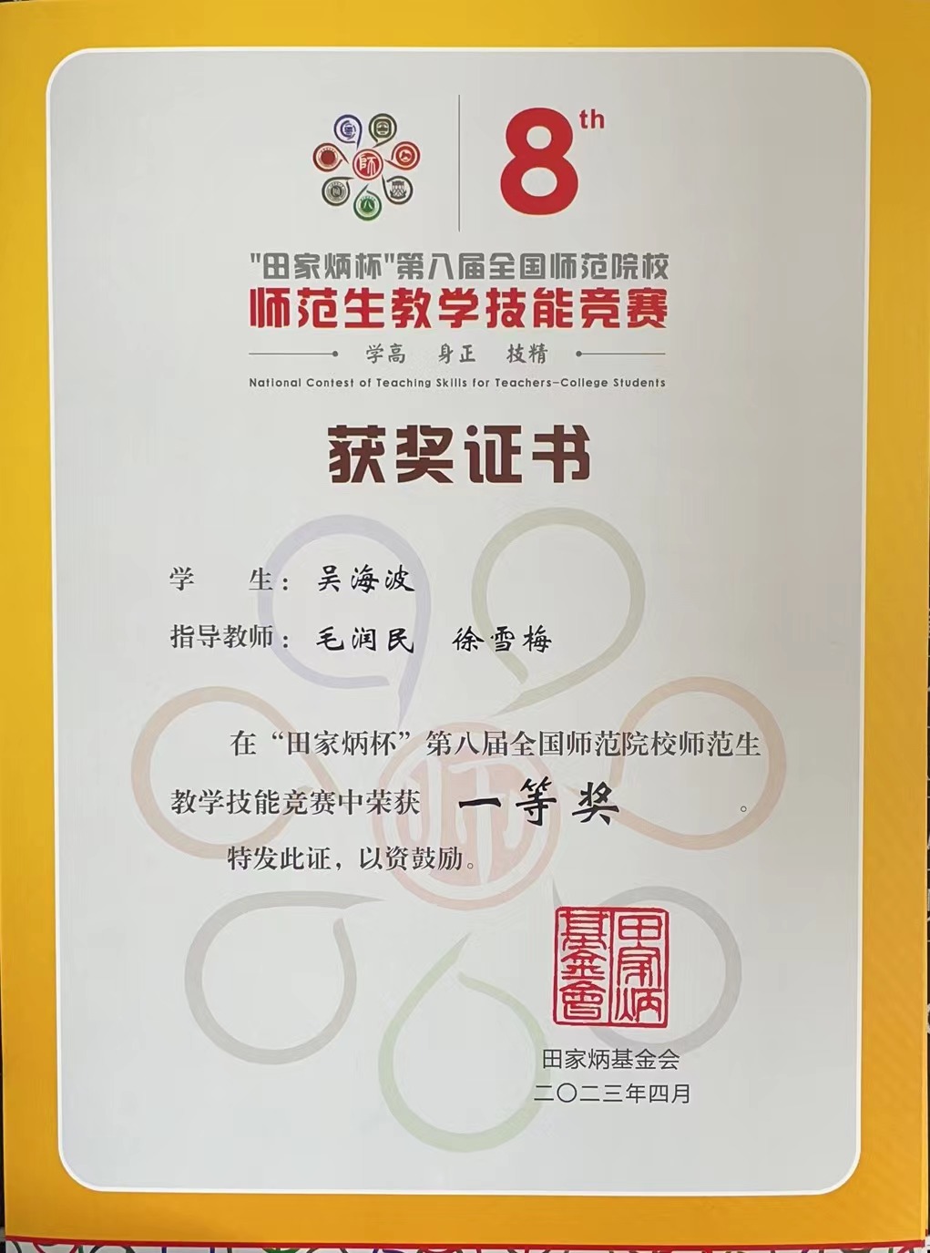 2023年4月14日至16日,在浙江师范大学举办的“田家炳杯”第八届全国师范院校师范生教学技能比赛汉语言文学组决赛中,MILE米乐集团2019级汉语言文学专业的吴海波同学荣获一等奖第三名的好成绩。