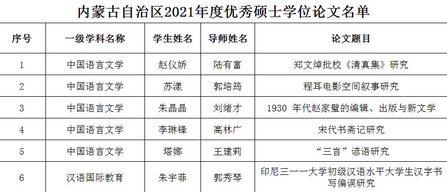 近日,自治区教育厅公布了2021年度自治区优秀博士、硕士学位论文评选结果,米乐官网《宋代书斋记研究》等6篇硕士学位论文被评为2021年度内蒙古自治区优秀学位论文,其中中国语言文学5篇,汉语国际教育1篇。本次全区共评选出137篇优秀硕士学位论文,我校共有26篇论文被评为自治区优秀研究生学位论文。