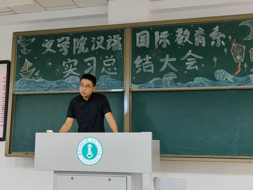 最后,国际交流学院徐剑老师对此次实习工作进行评价和总结。徐老师高度评价了2020级同学们的实习表现,并从教学、班主任工作、文化活动三个方面对未来的实习工作提出宝贵建议。徐老师希望同学们热爱自己的专业,互相学习,共同进步,一起为国际中文教育事业贡献力量。