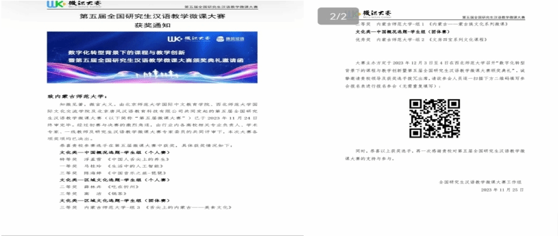 全国研究生汉语教学微课大赛是国内影响范围较广、体现研究生培养水平的国际中文教育专业类赛事,由北京师范大学国际中文教育学院、西北师范大学国际文化交流学院以及北京唐风汉语科技有限公司共同发起,大赛共有132所知名高校的4000多位学生报名参加,提交作品1900余件。经过初赛与决赛的激烈角逐,在业内专家和学者的共同评审下,于2023年11月25日公布了第五届全国研究生汉语教学微课大赛获奖名单。米乐官网学生表现优异,获得个人赛特等奖、一等奖、二等奖各一项,三等奖两项;团体赛三等奖两项,优秀奖一项。