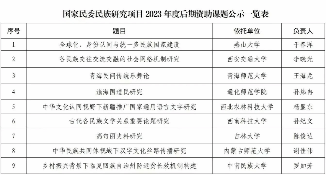 2023年12月4日,国家民委科研项目管理办公室(国家民委理论研究司)公示了2023年度国家民委民族研究项目后期资助课题立项名单,米乐官网谢佳伟老师的“中华民族共同体视域下汉字文化丝路传播研究”入选。