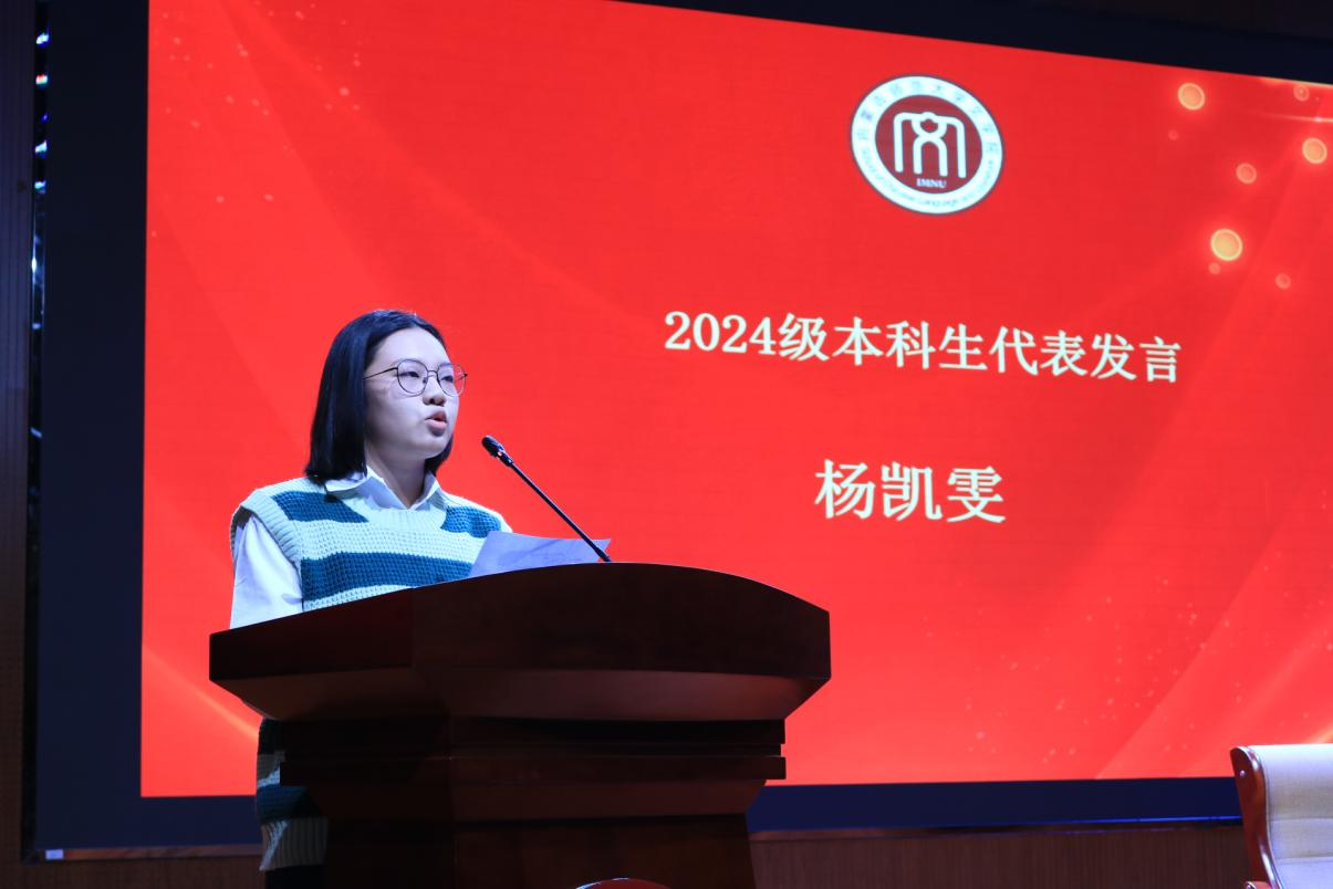典礼第三项,本科生新生代表——2024级汉语言文学公费师范生一班学生杨凯雯发言。行至大学这一崭新起点,她表达了对未来生活的憧憬和期许。此外,她表示作为师范生理应承担起“学高为师、身正为范”的责任担当,在MILE米乐集团的沃土上汲取知识和力量,虚心求教,久久为功,赓续前行。