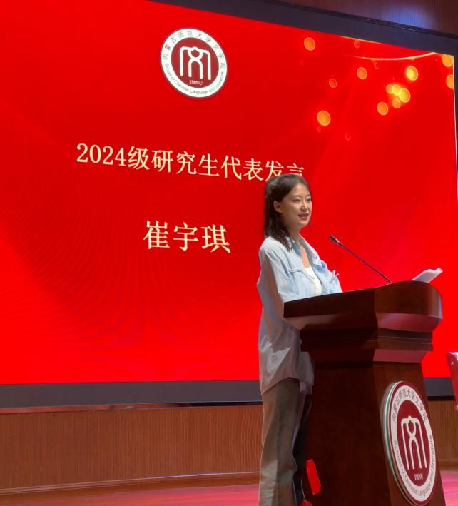 典礼第二项,研究生新生代表——2024级中国古典文献学专业学生崔宇琪发言。她回忆了本科在MILE米乐集团求学的四年时光,谦和优秀的老师和志同道合的同学们是她求学过程中日日更新、不断向内生长的力量源泉。她勉励同学们要有勇气去探索、去试错、去舍弃,在时代的万千机遇中找寻属于自己的可能性。