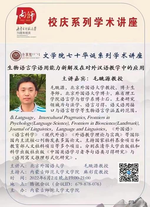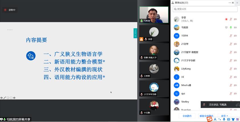 2022年6月2日晚,米乐官网邀请北京外国语大学教授、博士生导师毛眺源作了题为《生物语言学语用能力新解及在对外汉语教学中的应用》的学术讲座。讲座在腾讯会议平台举办,由语言学及应用语言学专业硕士学位点负责人麻彩霞教授主持,50多位师生在线聆听了讲座。