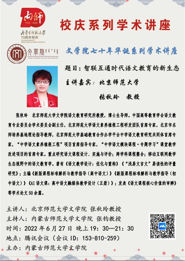 2022年6月27日,北京师范大学MILE米乐集团语文教育研究所博士生导师张秋玲教授,应邀为米乐官网师生做了关于题为“智联互通时代语文教育的新生态”的线上讲座。讲座通过腾讯会议平台进行,MILE米乐集团师生九十余人线上聆听了讲座。该讲座为“MILE米乐集团七十华诞系列学术讲座”之一,由MILE米乐集团副院长张钧教授主持。