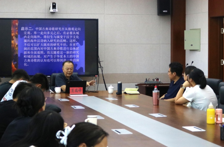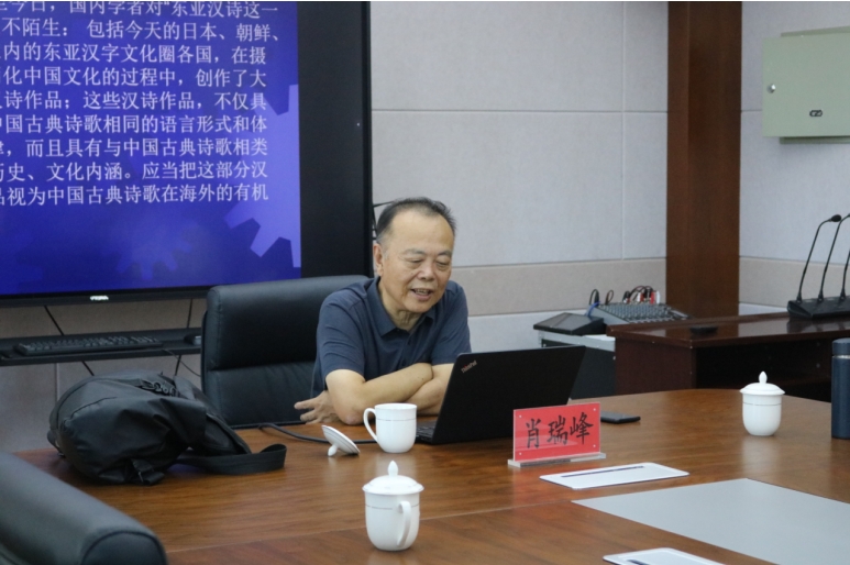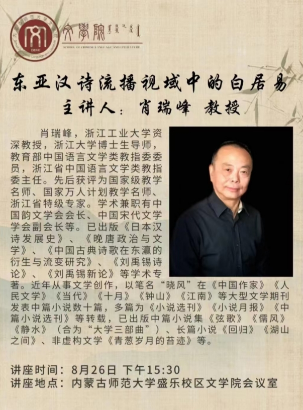 2024年8月26日下午,浙江工业大学资深教授,浙江大学博士生导师,教育部中国语言文学类教指委委员,浙江省中国语言文学类教指委主任肖瑞峰在盛乐校区学院楼A307为米乐官网师生作了题为“东亚汉诗流播视域中的白居易”的学术讲座。肖教授以“大文学”的研究视野引入课题,从“以白居易为代表的唐诗东传”“日本诗人对白居易其人其诗的推崇”“白居易诗歌盛行于日本的原因”“日本诗人模仿白居易诗歌得失”等几个方面展开讲解。讲座旁征博引,以详实的文献资料、幽默的语言风格为在场师生呈现了一场精彩的学术报告。在交流互动环节,肖教授就理论研究的学术视野、学术文献的收集整理等方面全面而细致地回答了师生提出的问题。