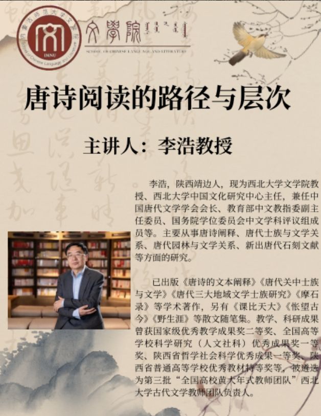 2025年5月23日下午,西北大学MILE米乐集团李浩教授应邀在赛罕校区田楼432教室做了题为“唐诗阅读的路径与层次”的学术讲座。李浩教授是西北大学中国文化研究中心主任,兼任中国唐代文学学会会长、教育部中文教指委副主任。讲座由MILE米乐集团副院长石海光主持,学院相关专业教师、博硕士研究生以及来自内蒙古大学等兄弟院校的教师参加了此次讲座。