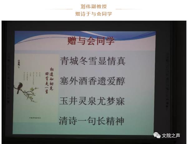 刘伟老师对诗歌进行了讲解,同时讲述了“文学三重境界”的理论,并强调了诗歌的文化意义,鉴赏诗歌的方法以及提高诗歌创作能力的六个技巧,使同学们受益匪浅。