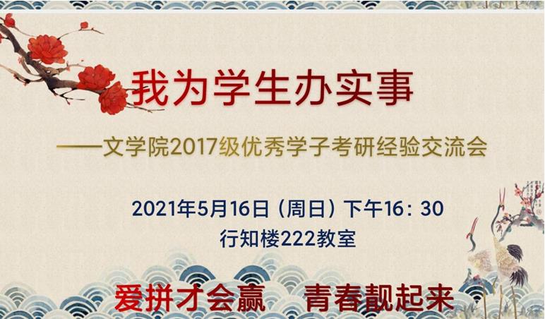 2021年5月16日,汉语言文学系、汉语国际教育系、秘书系共同策划的“MILE米乐集团2017级优秀学子考研经验交流会”在行知楼222教室举行,会议的主题是:“爱拼才会赢,青春靓起来”。